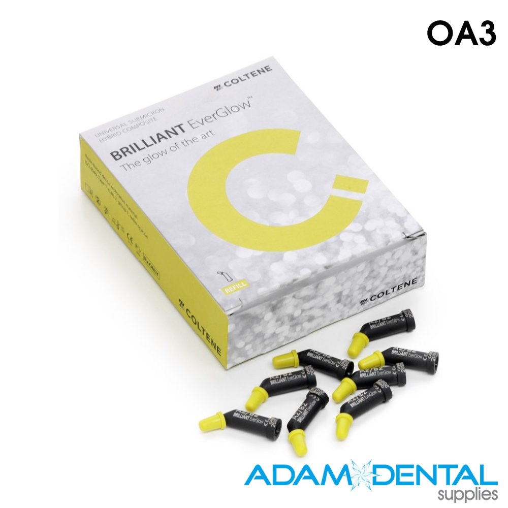 Seven Universal, Two Translucent And Three Opaque Shades For An Easy Shade Selection BRILLIANT EverGlow represents a new generation of composites from COLTENE. Due to the intelligent composition including special fillers, this Universal Submicron Hybrid Composite offers an exceptionally uniform and smooth surface. In addition, the versatile filling material excels through its extremely durable gloss properties.